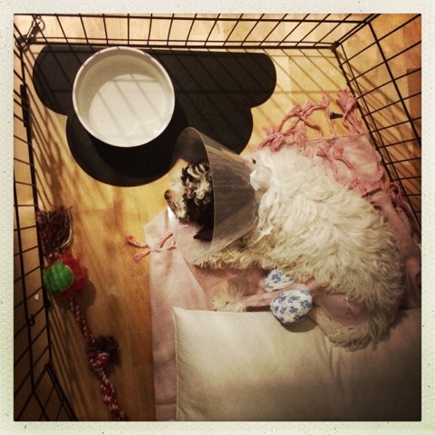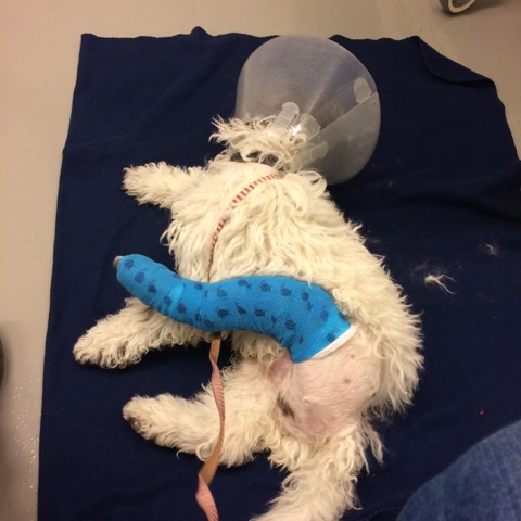 Tämä vilkkaus ja uteliaisuus kostautuikin tammikuussa 2015 Pennille ikävällä tavalla. Hypätessään liukkaalla parketilla hän liukastui ja takajalka jäi selän alle. Voi mitä tuuria! Aluksi ajattelimme, että ehkä se vain meni sijoiltaan, mutta pian eläinlääkärillä huomattiin, että kyllä se on pahasti murtunut. Itse asiassa niin pahasti, että päivystävä lääkäri antoi kaksi vaihtoehtoa: vuoden kuntoutus ja kaksi isoa leikkausta tai koira on lopetettava.